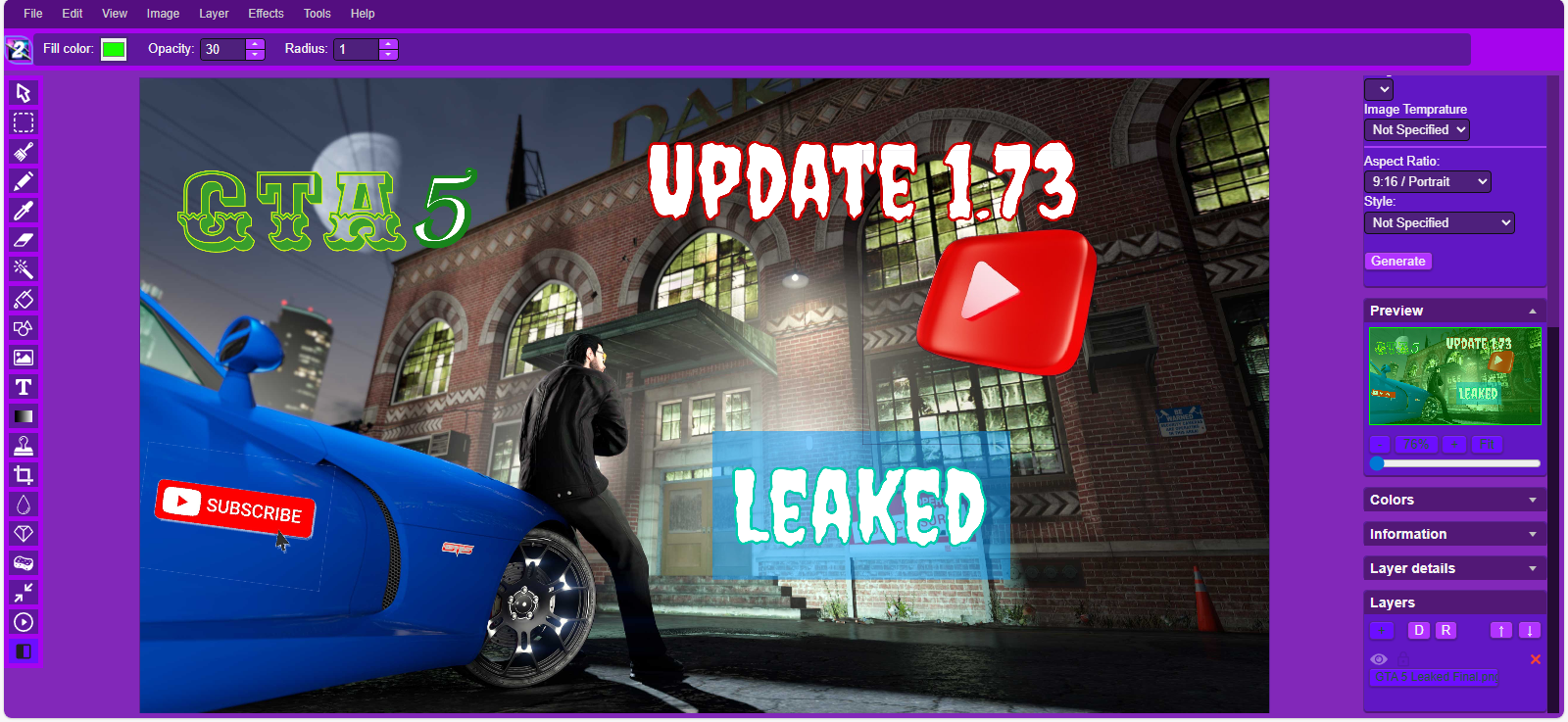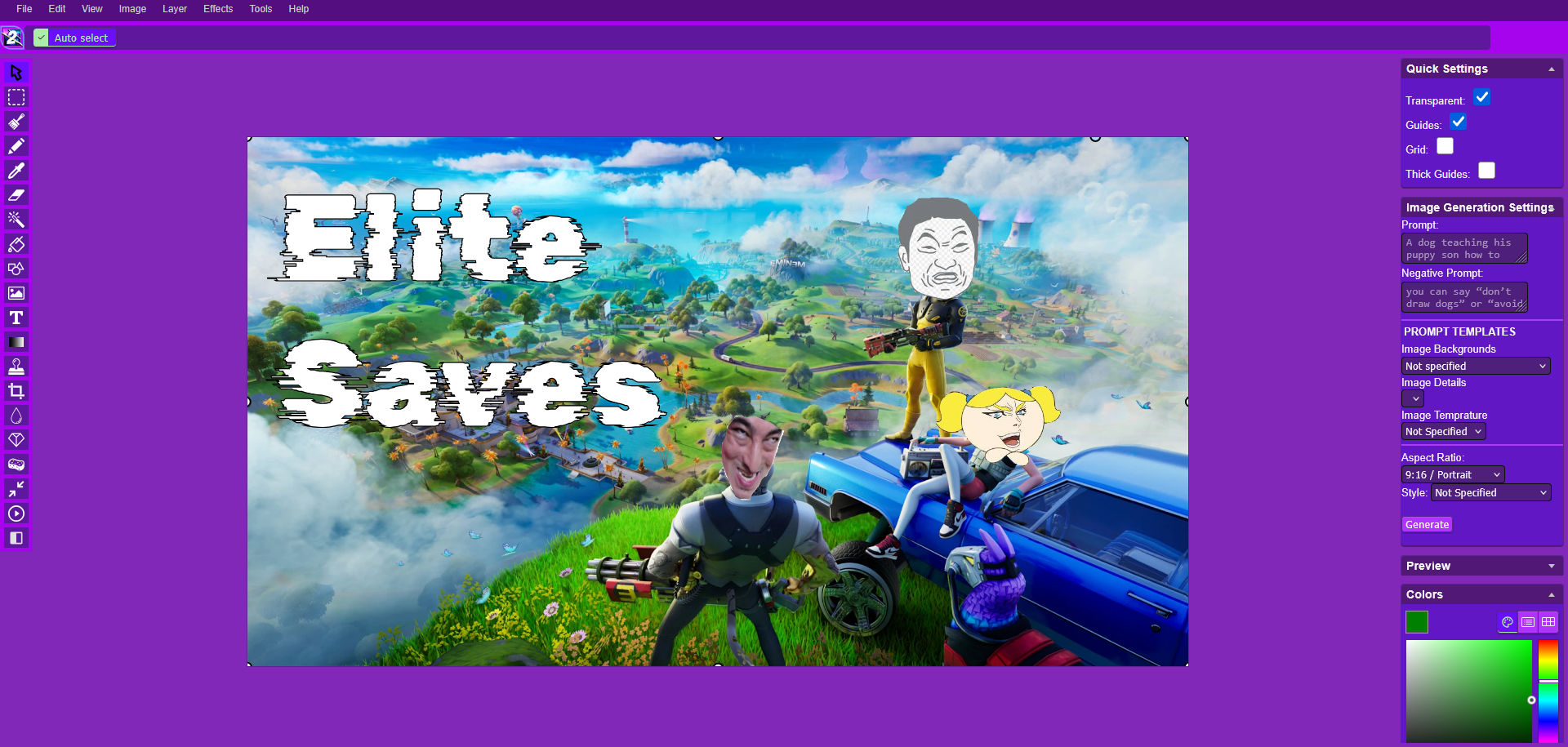 Tools: panel, pencil, brush, magic wand, eraser, fill, color picker, letter, crop, blur, sharpener, desaturation, clone, borders, sprites, keypoints, color zoom, change color, restore transparency, content fill, AI Image Generations
