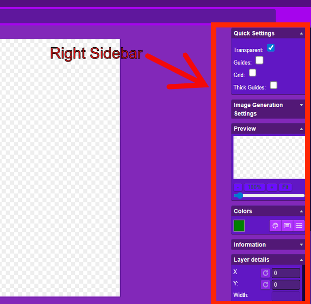 “When a tool or element is selected, the right sidebar displays relevant settings like opacity, size, and position. You can also toggle grid lines and transparency guides.”