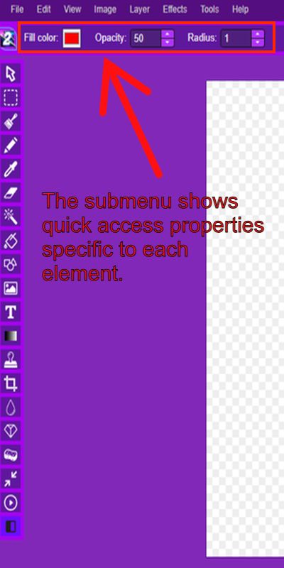 “The left sidebar contains all drawing and editing tools. Hover over each icon to see its name and use it to interact with the canvas. Tools include selection, brushes, fill, text, shape, crop, and more.”